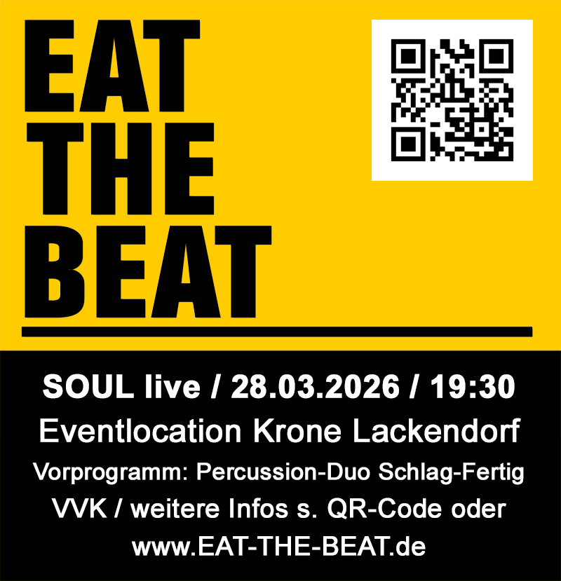 die Eventlocation Krone Lackendorf, das Percussion-Duo Schlag-Fertig und EAT THE BEAT laden euch zu einem besonderen Live-Konzert ein.